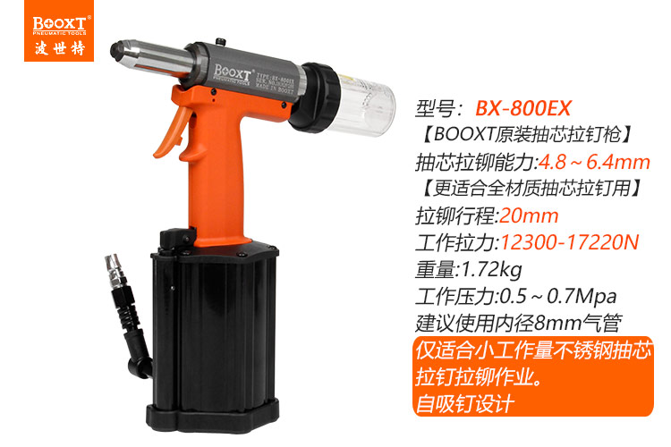 東莞市強勁五金工具有限公司提供臺灣BOOXT波世特品牌氣動工具,氣動抽芯鉚釘槍BX-800EX(自吸釘)廠家直銷,首件享特價。咨詢熱線:4008301980