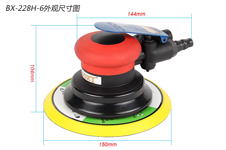 • 產(chǎn)品參數(shù): 底盤尺寸:150mm 空載轉(zhuǎn)速:11000rpm 偏擺直徑:9mm 重 量:0.9kg 耗 氣 量:1.6cfm/min(粗磨)