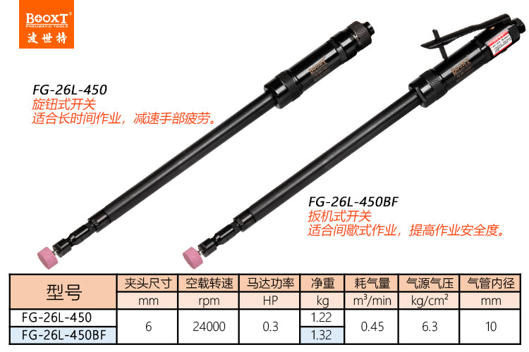 東莞市強勁五金工具有限公司提供臺灣BOOXT波世特品牌氣動工具,加長氣動直磨機FG-26L-450BF廠家直銷,首件享特價。咨詢熱線:4008301980