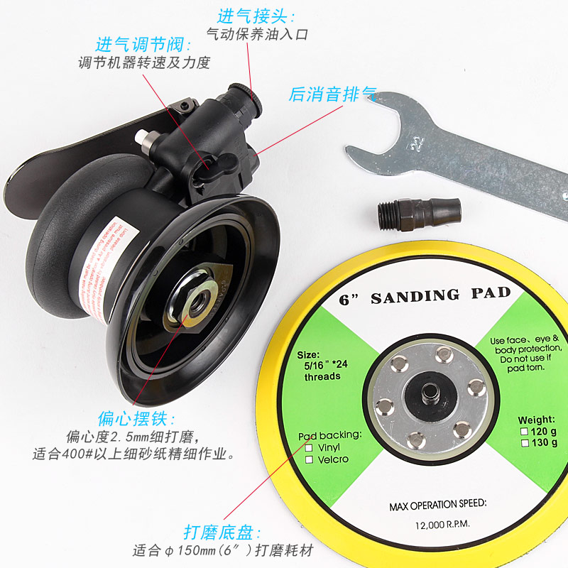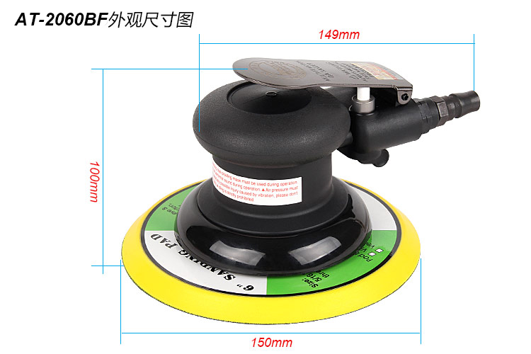 • 產(chǎn)品參數(shù): 底盤尺寸:150mm 【6寸】 空載轉(zhuǎn)速:12000rpm 偏擺直徑:2.5mm 重 量:0.84kg 噪 音 值:78db 耗 氣 量:170L/min 【細(xì)磨】