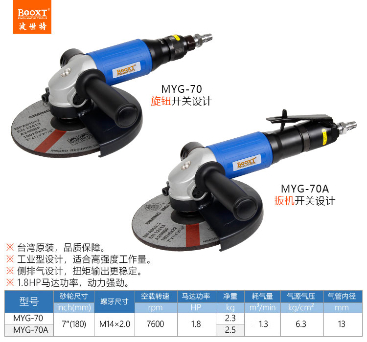 東莞市強(qiáng)勁五金工具有限公司提供臺(tái)灣BOOXT波世特品牌氣動(dòng)工具,7寸氣動(dòng)角磨機(jī)MYG-70A廠家直銷,首件享特價(jià)。咨詢熱線:4008301980