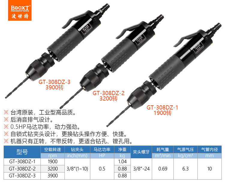 東莞市強勁五金工具有限公司提供臺灣BOOXT波世特品牌氣動工具,自鎖夾頭氣鉆GT-308DZ-1廠家直銷,首件享特價。咨詢熱線:4008301980