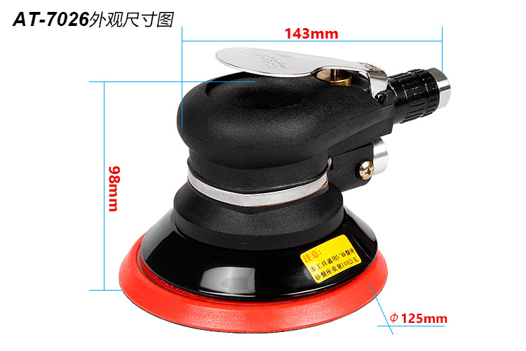 • 產品參數: 底盤尺寸:125mm 【5寸】 空載轉速:12000rpm 偏擺直徑:5mm 重 量:1.0kg 耗 氣 量:0.48m3/min 【工業型】